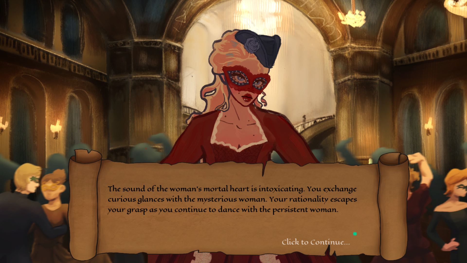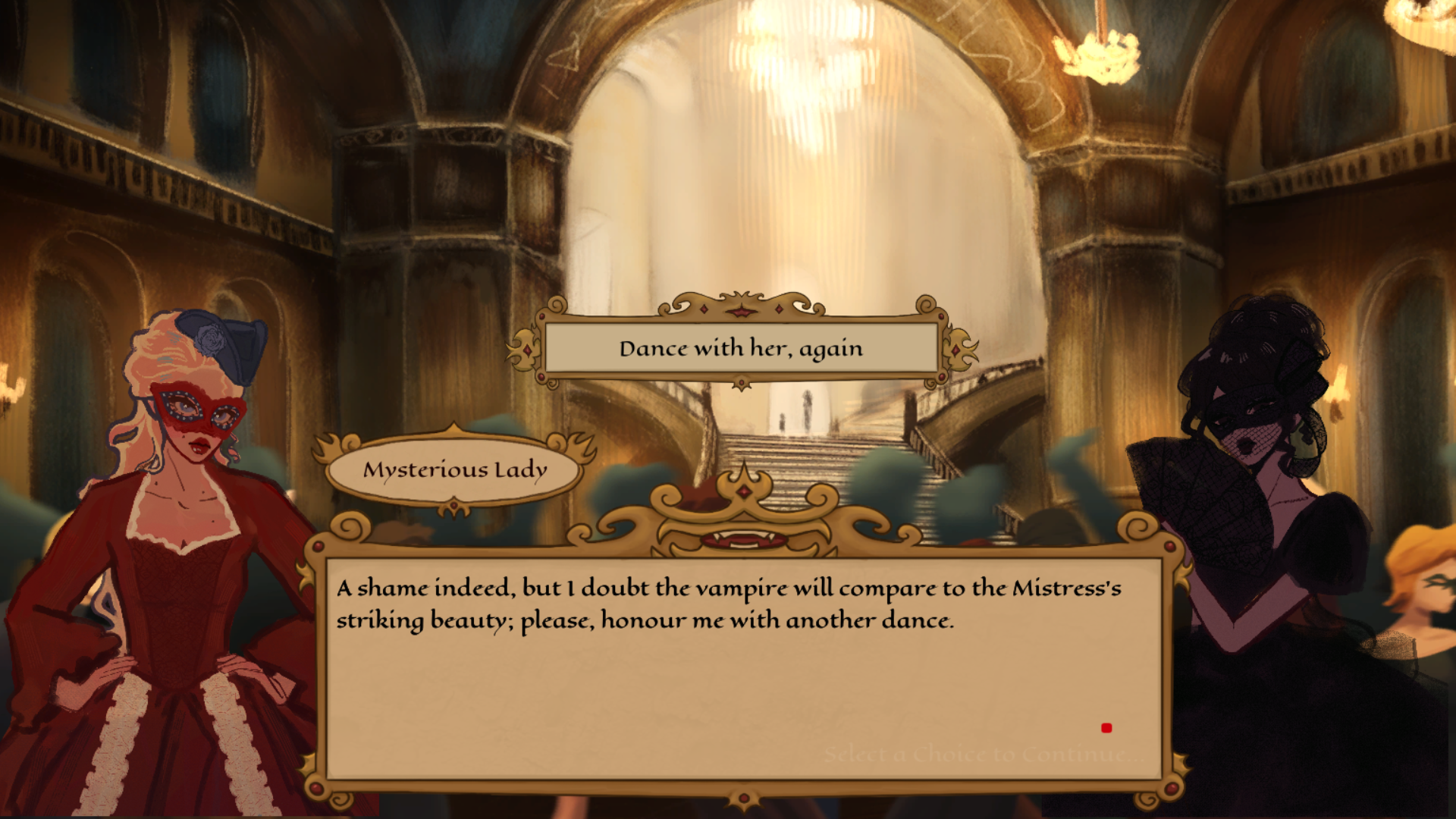 In this game, you are a vampire who attends a masquerade ball to both hide your identity, but also scope potential target. There is, however, also a vampire hunter at the ball looking for you. You must carefully navigate your interactions and dances with her to get close enough for a bite, without being revealed first.